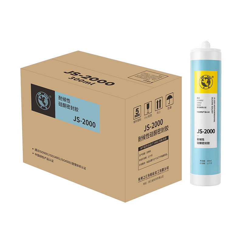 JS-2000 建筑用耐候硅酮密封膠是一種單組分、中性固化、專為建筑幕 墻中的耐候、防水密封而設計的。可在-5℃-40℃條件下輕易地擠出使 用,依靠空氣中的水分固化成優異、耐用的彈性硅酮橡膠。